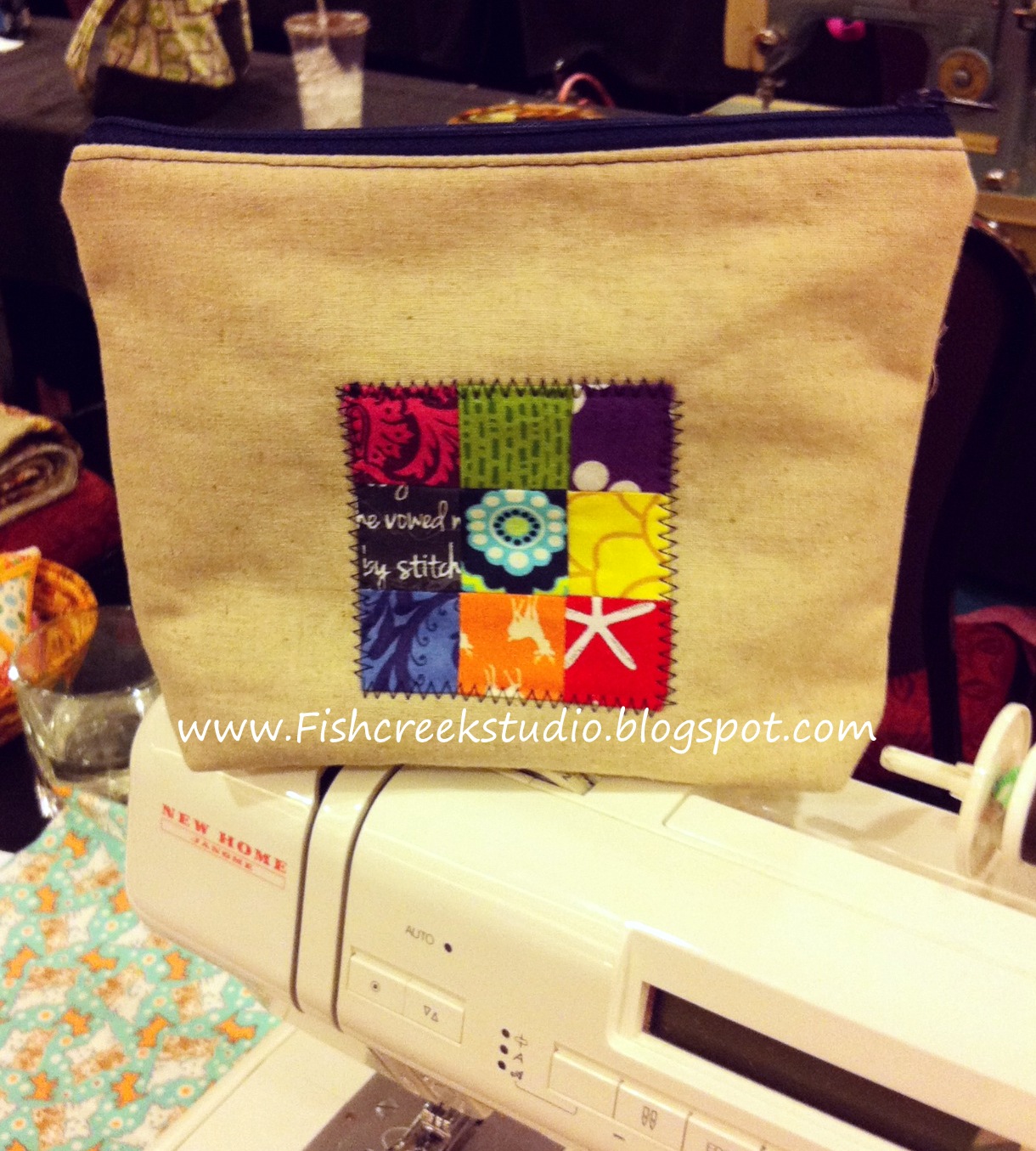 Next was PJ pants. I chose not to make these as I have prior garment sewing experience and really just wanted to do some free time sewing. There were many very cute pairs completed. Again so nice to have a completed project to take home. Inspired by the Sew South banner that has cute bunting on it,  I used this time to make a little zippy pouch. This had been in the back of my mind after seeing this cosmetic bag. I used natural colored linen and some scraps and raw edged appliqued the front.